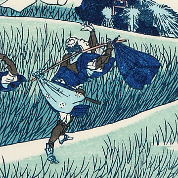 題名のとおり、全図に富士山のある風景を描いたシリーズ物で、葛飾北斎の代表作にとどまらず、浮世絵風景画の代表作ともいわれています。はじめ、三十六図が刊行されましたが、好評のため十図が追加され、計四十六図が刊行されました。当初の三十六図を「表富士」、追加の十図を「裏富士」と呼びます。富士山への篤い信仰は今と変わらず人々の間にあり、当時、集団で富士山に参拝する「富士講」が盛んに行われるなど、こうした社会背景のなかで北斎は『富嶽三十六景』を描き、爆発的ヒットとなりました。