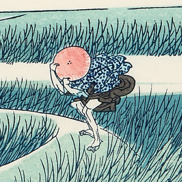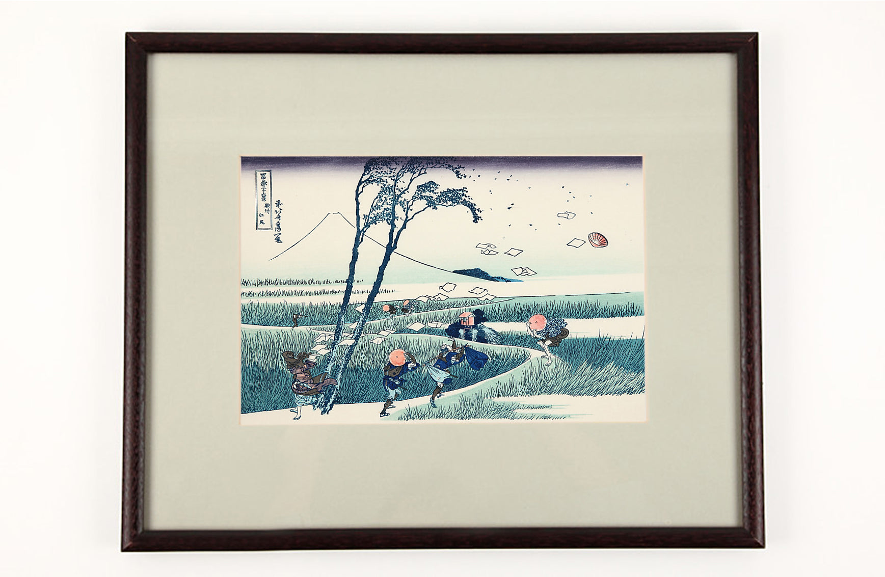 道ゆく誰もが一陣の突風に飛ばされんばかり、体を支えるのさえやっとという描写の巧みさは北斎ならではの技量です。いかに強風かが効果的に描かれている一方、富士山だけは平然としている。そのコントラストが自然の偉大さを表現しています。この絵はイギリスの写真家 Jeff Wallの 「Sudden Gust of Wind」という作品に時を越えて多大なる影響を与えています。