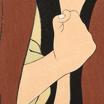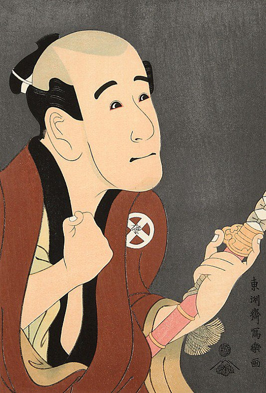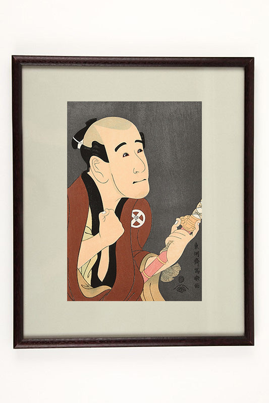 演じている大谷徳次は当時の道化役の一人者でした。下がった眉、つぶらな眼にその滑稽味がよく表れています。この絵で、写楽は人物を思いきって左へよせ、右側をひろく空間にするという構図法をとって成功しています。落款さえも右下に入れ、顔の前面に余裕をもたせることで徳次の動く美しさ、顔面描写がさらに生きています。また三つの類似型をつみ重ねる写楽独特の構図法を用いています。顔の輪郭と右手のコブシで大小二つの類似型で左側を固め、これに対して刀の鍔下を握っている左手の同型の類似型を描き、絵の均衡と安定をはかっているのです。色彩は渋い着物の色を大部分とし、あとは僅かな濃い黄と朱だけで、そのなかで刀の鞘の朱の色が全体のきき色となっています。少ない描線、少ない色彩で絵の効果を考えるのは、写楽の絵の特色ですが、その特徴を最もよく知ることのできる作品といえます。