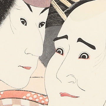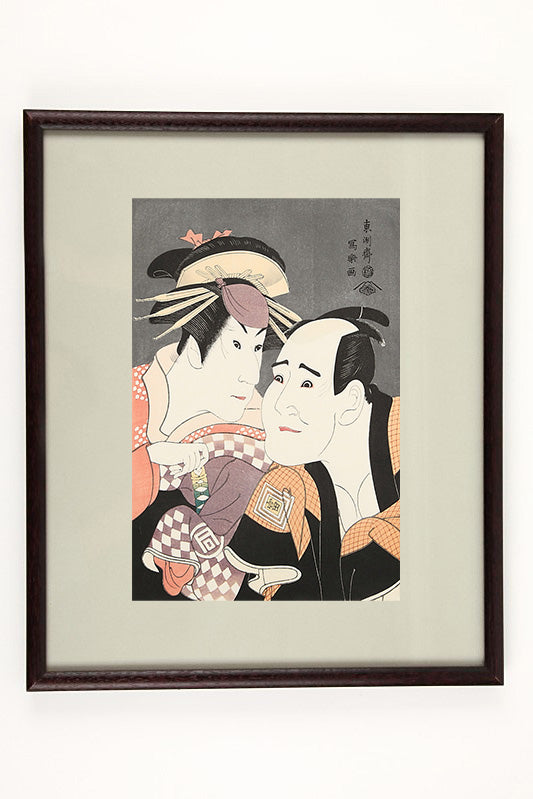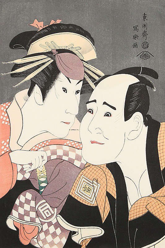 写楽は、第一期作品中で半身二人立の絵を五図描いていますが、これはそのうちの一図で、「花菖蒲文禄曽我」の狂言に登場する二人を描いた作品です。写楽はこれら二人立半身図の上で、つねにいくつかの対照をとらえています。この絵では、佐野川市松の痩せた顔と市川富右衛門の太った顔、市松の上がり眉と富右衛門の下がり眉、市松のおさ形の眼と富右衛門の丸い眼、といったようにそれぞれの対照によって絵に変化を与えています。この絵は無雑作に二つの肖像を寄せ集めたような感じですが、前述のいくつかの対比の妙によって巧みにコントラストをつけています。市松の白人おなよを一人立で描いた絵は別にありますが、この絵ではむしろ富右衛門の描写を見るべきです。この蟹坂藤馬という役は、悪人たちの方の人物ではありますが、たいした役でなく、富右衛門も上級の貧乏らしさ、これが市松の白人(私娼のこと)おなよの派手さと、これも画面の上のコントラストとしての面白さをみせています。