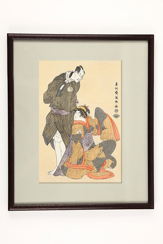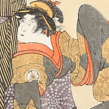 寛政六年七月、河原崎座上演二番目狂言の「桂川月思出」のお半長右衛門道行の場を描いた作品です。写楽は第二期作品中、大判全身二人立の作を七枚描いていますが、これはそのうちの一図になります。お半長右衛門の道行という常盤津を伴奏としての振事で、その色気のある雰囲気を写楽は描き出そうとしたため、七枚中では最もおだやかな絵となっています。道行の場合、女役に口説きがあって振りが多く、男役はもたれ役といって振りの少ない作品でした。この絵でも長右衛門はじっと立っている姿、お半は振事の一瞬きまった姿をとらえています。あどけないお半の姿態の表現をする半四郎が実に巧みに描かれています。