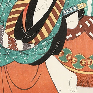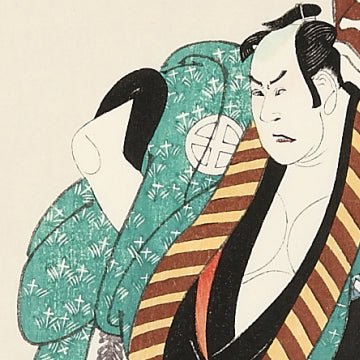 寛政6年(1794)、浮世絵界に彗星のように登場し、わずか10ヶ月の作家活動の間に140数点もの浮世絵を世に送り出すと忽然と姿を消しました。写楽は大判のしかも背景を高価な黒雲母摺という尋常ならぬデビューを果たしました。版元の蔦屋重三郎は、歌麿が重三郎の専属を離れたのちに大々的に写楽を売り出しましたが、次第に大判が少なくなっていきます。その理由として、写楽の人気役者であろうと美化せずに、ありのままを描きとる筆致は、役者ファンをはじめ当時の人々の好みに合わなかったからなのかもしれません。しかし、どれも躍動感にあふれた役者絵は見る者に強烈なインパクトを与え、海外でも高い評価を得ています