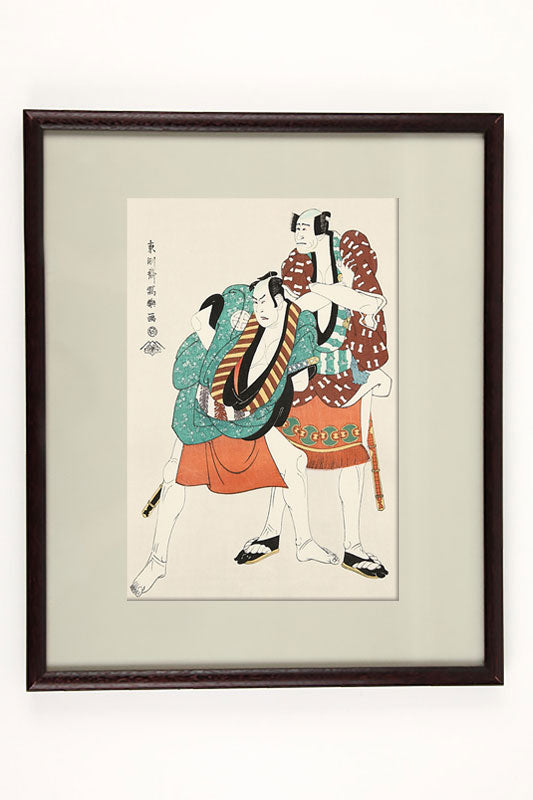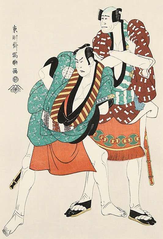 寛政六年七月、都座上演の「けいせい三本傘」に登場する竜蔵と広次を描いた作品です。この狂言には、善人の名古屋山三と悪人の不破伴左衛門がありますが、その名古屋山三の下僕が広次の土佐の又平で、不破伴左衛門の下僕が浮世又平でした。したがってこの二人の奴はやはり善悪の二人で、その役柄が対照的に表現されています。写楽は全身図で、舞台上の役者を下から仰ぎ見る描写を用いて構図美を示していますが、この絵は最もそれを現わしています。また二人を大きな三角形、一人一人を小さな三角形と、三つの大小の三角形の組み合わせで画面の安定した機構美を表現しています。