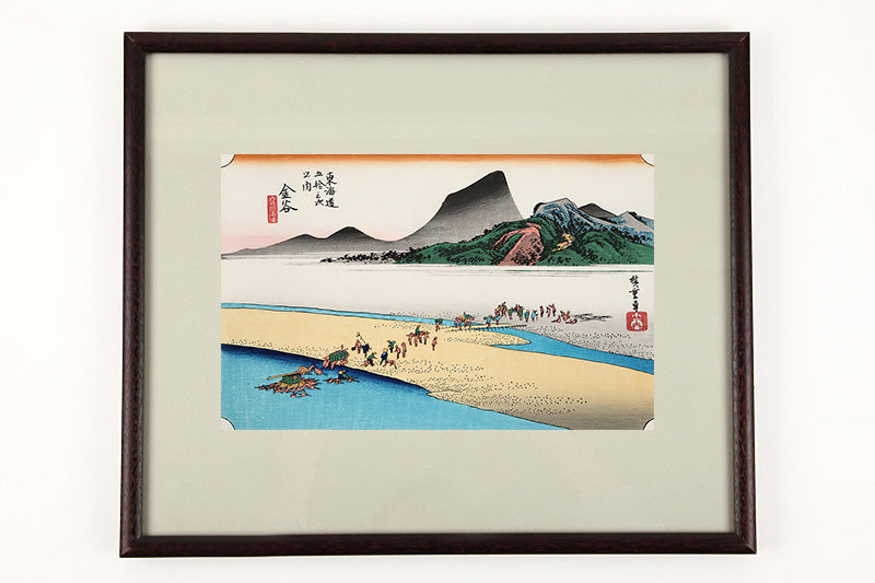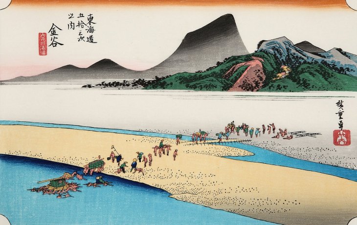 嶋田から大井川を渡って金谷宿まで4キロ。広重は金谷側から見た大井川の川渡しを描いています。