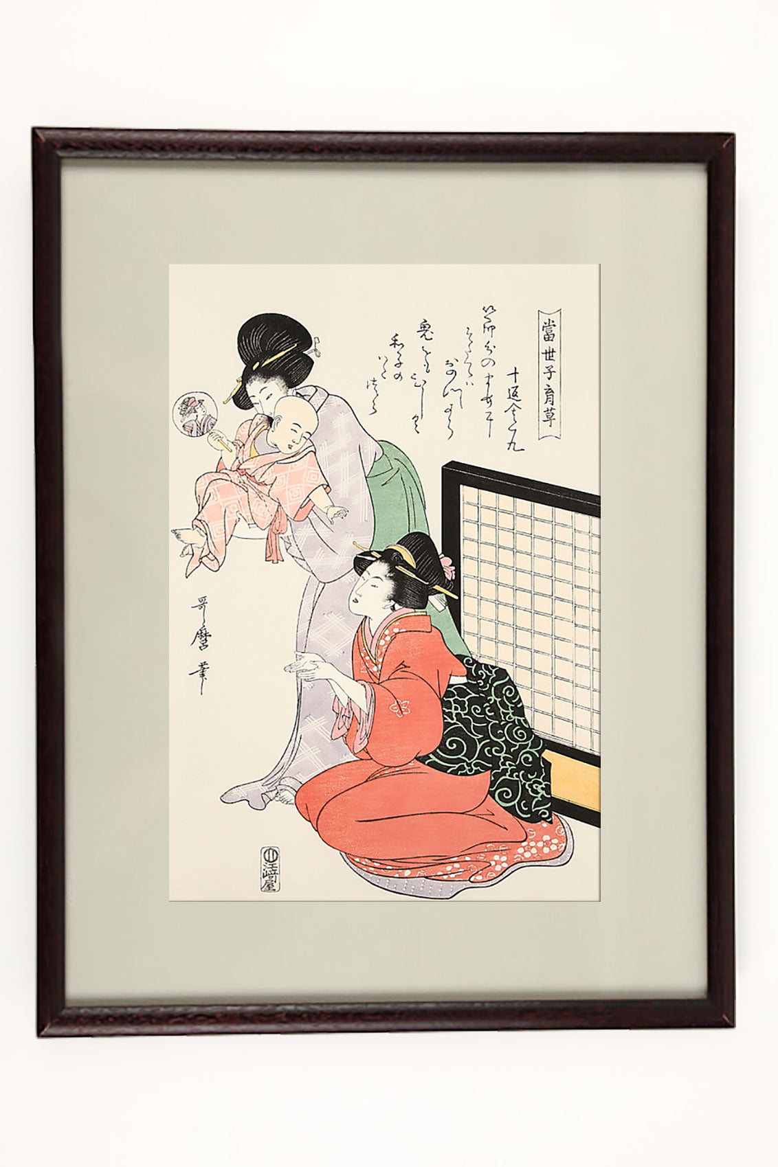 これは文化元年頃の作品で、この頃になると子どもをテーマにした作品が多くなってきています。この年、太閤記を題材にした作品によって入牢および手鎖五十日の刑を受け、心身ともに疲れをみせる歌麿ですが、衝立てと二人の女性と子どもをひとつの画面に巧みに描き込み、安定した構図を示しています。