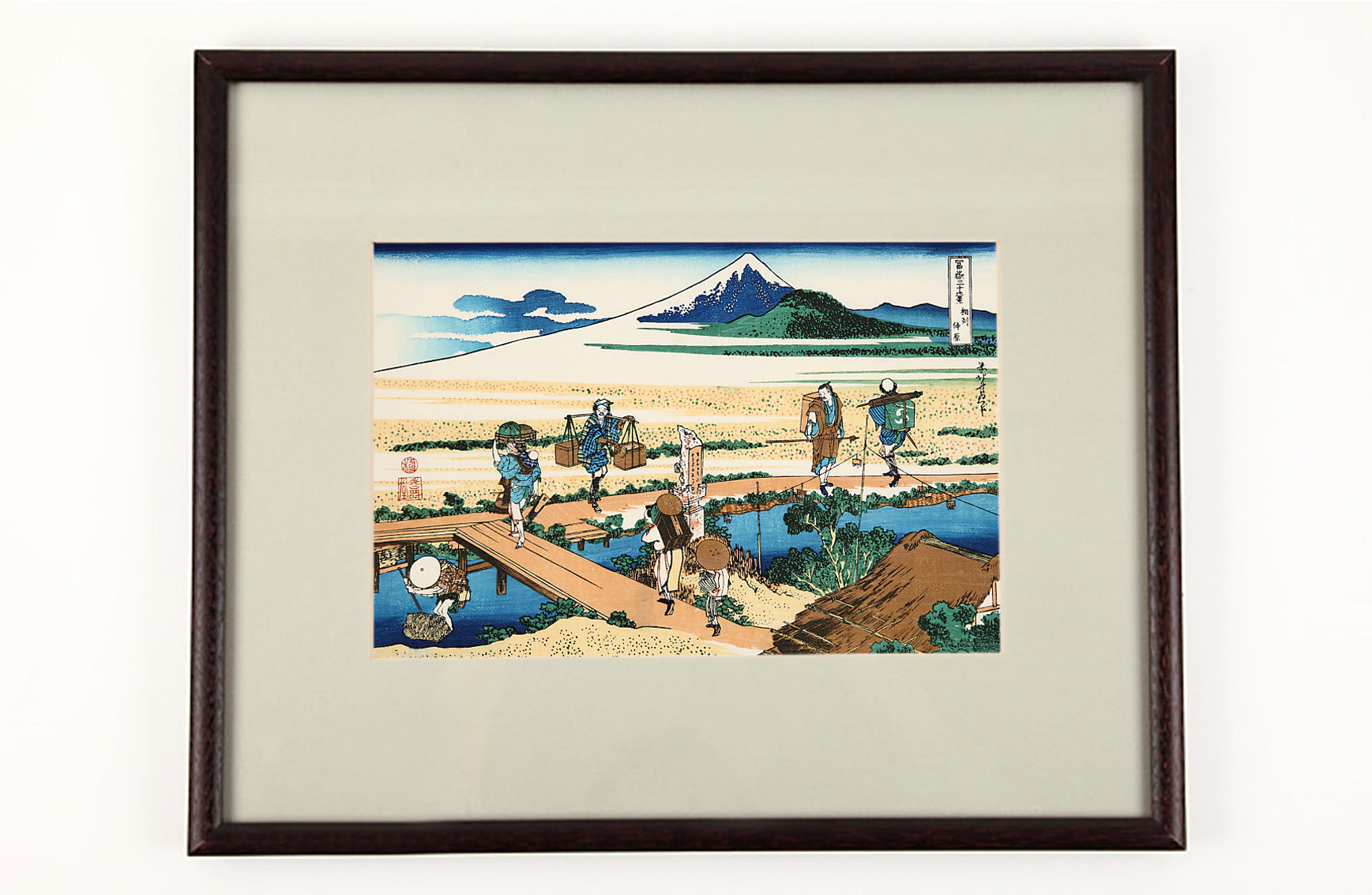 題名のとおり、全図に富士山のある風景を描いたシリーズ物で、葛飾北斎の代表作にとどまらず、浮世絵風景画の代表作ともいわれています。はじめ、三十六図が刊行されましたが、好評のため十図が追加され、計四十六図が刊行されました。当初の三十六図を「表富士」、追加の十図を「裏富士」と呼びます。富士山への篤い信仰は今と変わらず人々の間にあり、当時、集団で富士山に参拝する「富士講」が盛んに行われるなど、こうした社会背景のなかで北斎は『富嶽三十六景』を描き、爆発的ヒットとなりました。