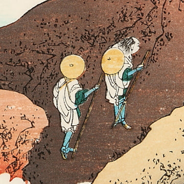 なぜなら、この荒々しい岩肌こそが富士山そのものだからです。この絵は峨々たる山中の富士登山者を描いており、風景画というより風俗画といった方がいいかもしれません。白衣をまとった富士講の人々が白雲をついて登っていく姿のそれぞれに北斎独特の力強よい筆致が見られ、登山の困難が如実に伝わってくるようです。その登山者の心こそ、北斎の富士山に対する尊心のあらわれではないでしょうか。