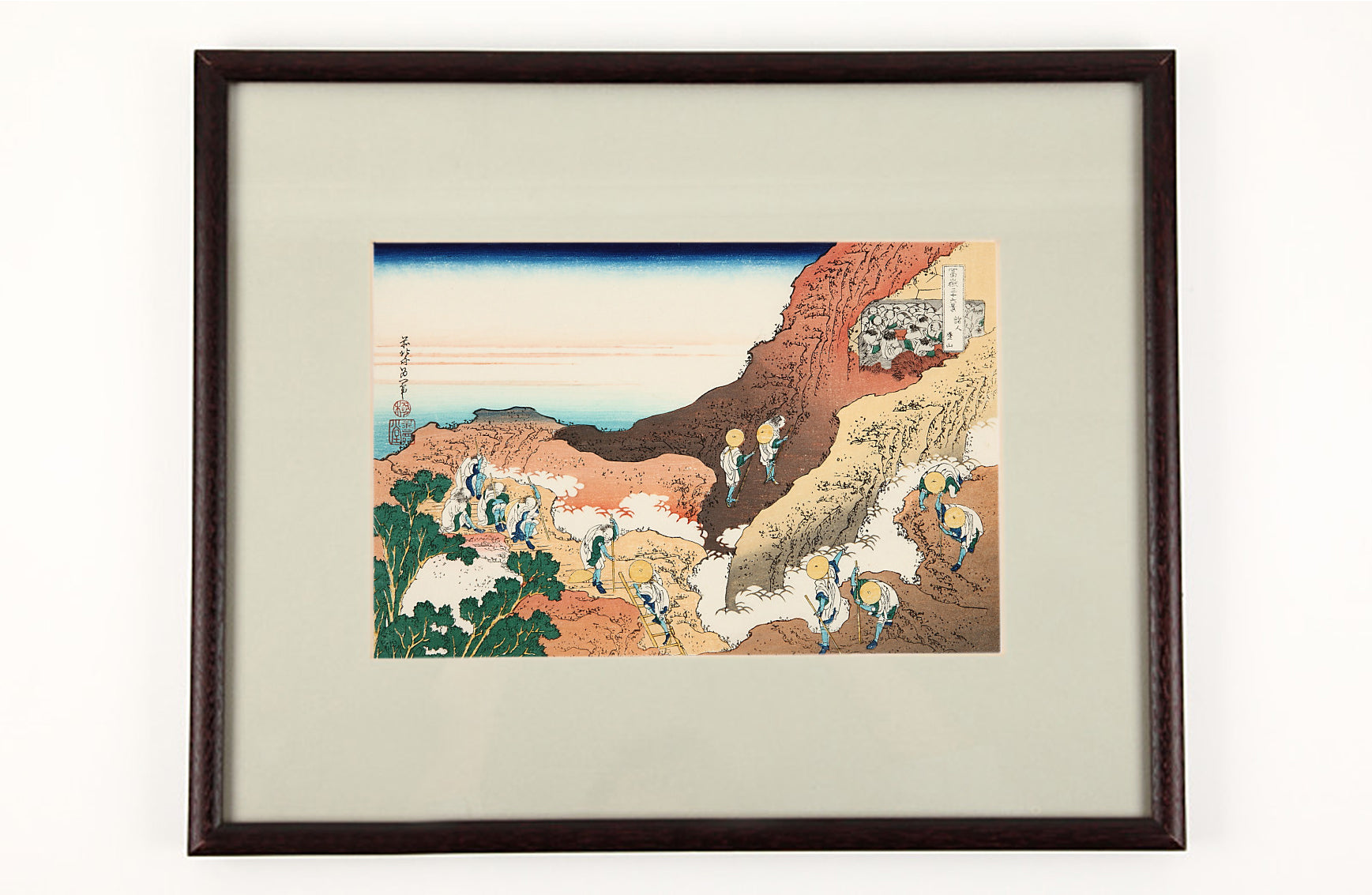 題名のとおり、全図に富士山のある風景を描いたシリーズ物で、葛飾北斎の代表作にとどまらず、浮世絵風景画の代表作ともいわれています。はじめ、三十六図が刊行されましたが、好評のため十図が追加され、計四十六図が刊行されました。当初の三十六図を「表富士」、追加の十図を「裏富士」と呼びます。富士山への篤い信仰は今と変わらず人々の間にあり、当時、集団で富士山に参拝する「富士講」が盛んに行われるなど、こうした社会背景のなかで北斎は『富嶽三十六景』を描き、爆発的ヒットとなりました。