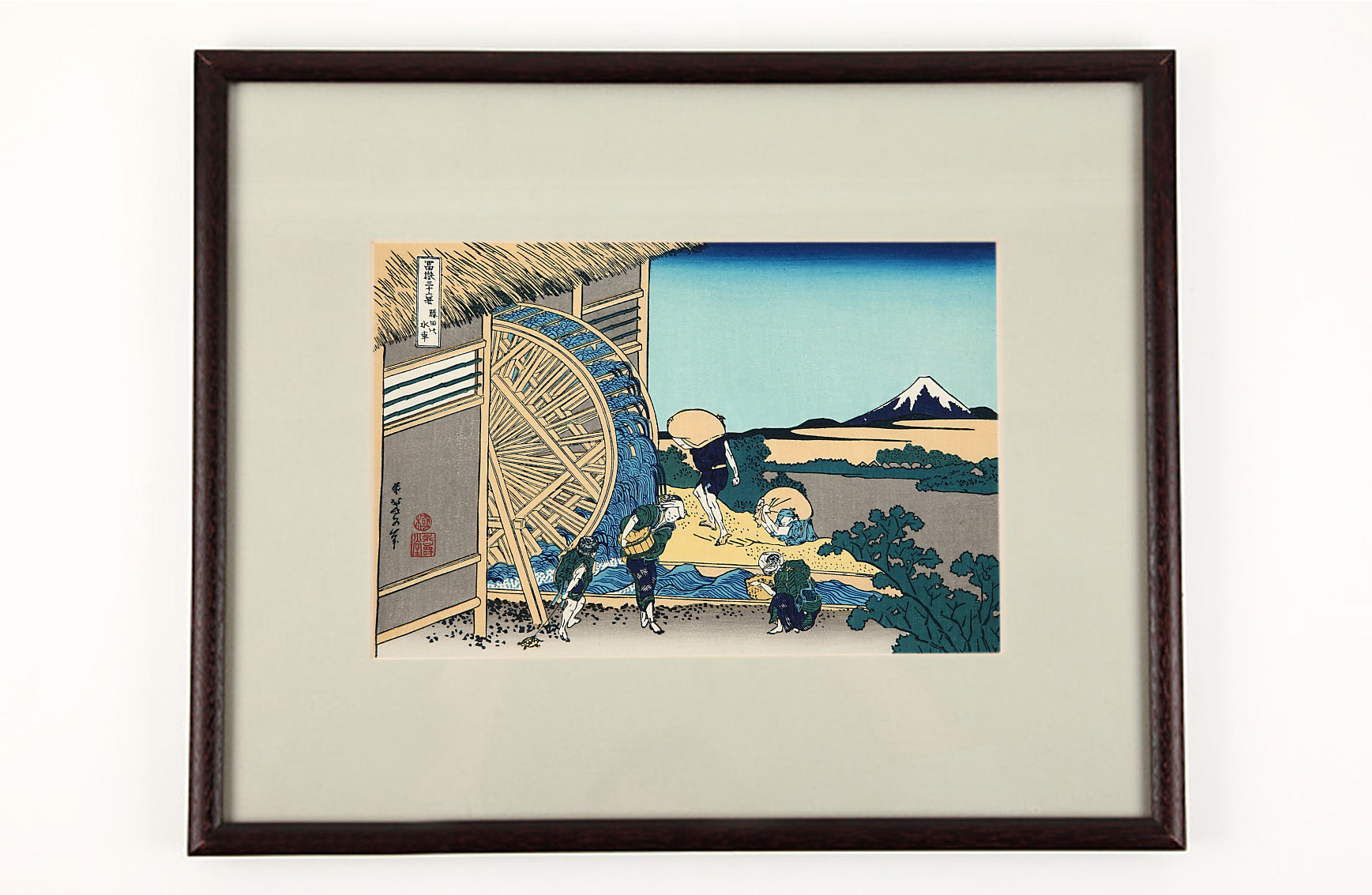 これは水車小屋が主体の絵ではありますが、水車から溢れんばかりにこぼれ落ちる水がいきいきと描かれ、北斎の芸術を遺憾なく表しています。籾をかつぐ農夫二人、流れ水で米をとぐ農夫、亀の子をもつ子供。これらの人物が遠くに望む富士山と千変万化する水流の動きとともに、心地よい田園の風景を作り上げています。
