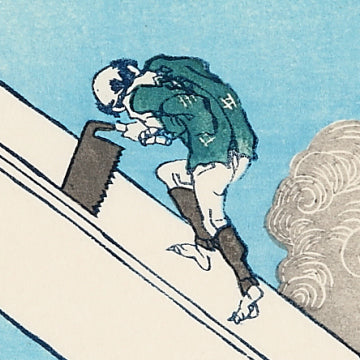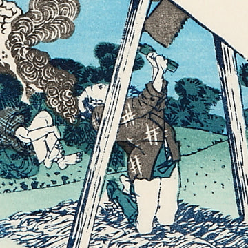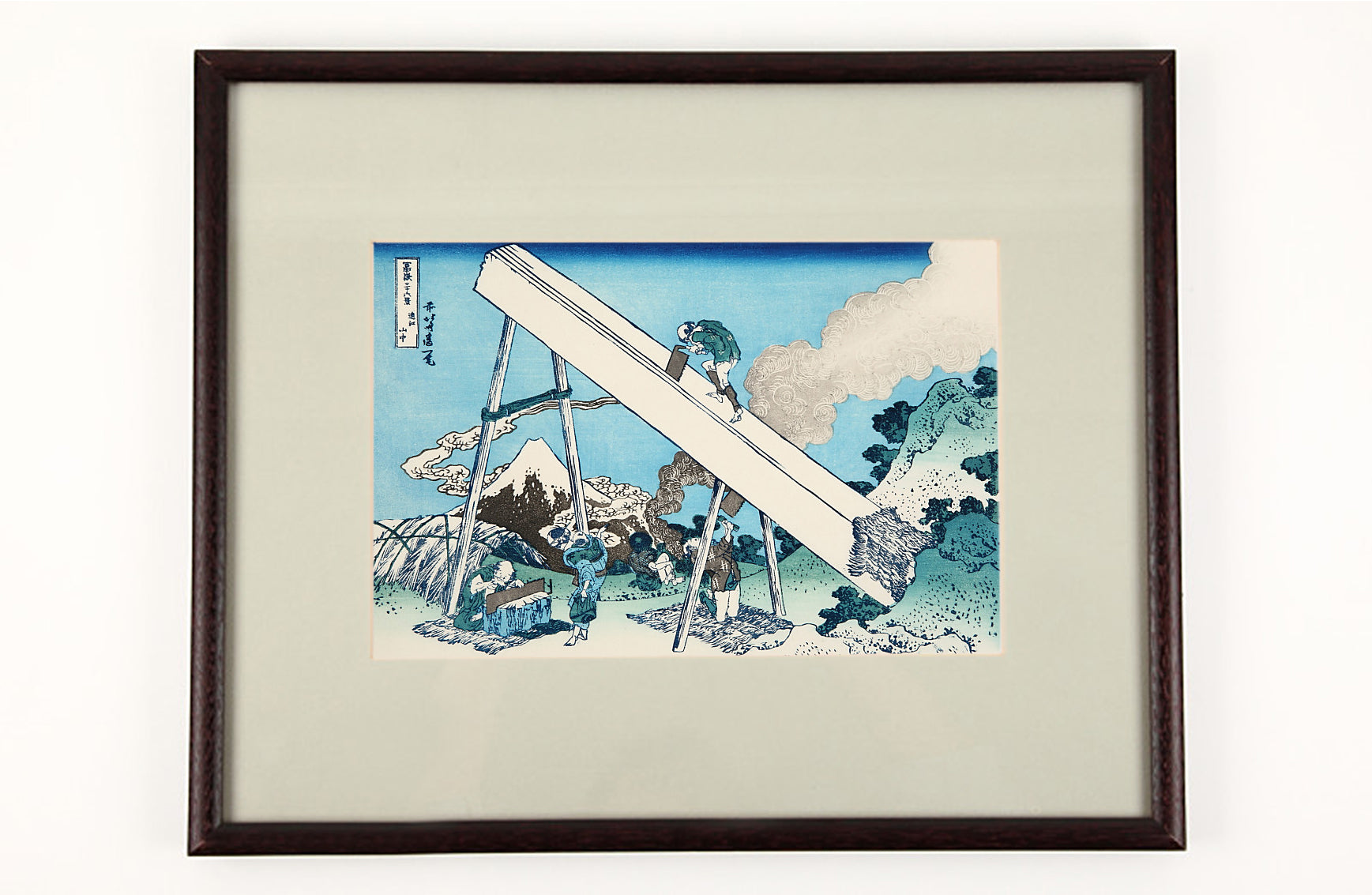 左から右へ大胆な対角線に大きな材木を描き、木挽き職人が上から、もう一人は下から巨大な材木を挽く姿が印象的です。巨材を支える三又の足場、その間に見える富士山の姿も三角と、三角形を駆使して作り上げたこの絵は、一種の機構美を見る人に感じさせてくれます。その間をぬうような焚火の煙りと富士山を巻く巻雲によって構成され、この絵をさらに優れたものにしています。