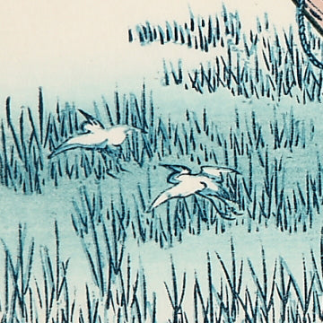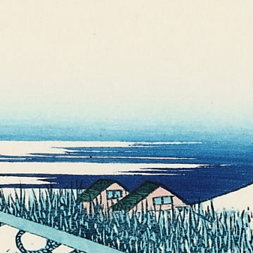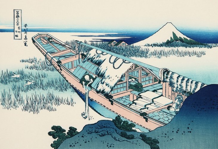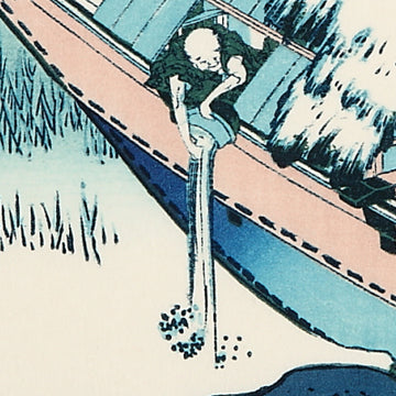 釜から米の研ぎ汁をこぼす船頭の動きは、静かな水郷の朝を感じさせてくれます。その水の音と白鷺の羽音ただ二つの音しか聞こえない、それほどの静かさを感じる霞ヶ浦の水郷の景観を藍色が効果的に表現しています。霞ヶ浦は当時、富士山が眺望することのできる景勝地として有名でした。
