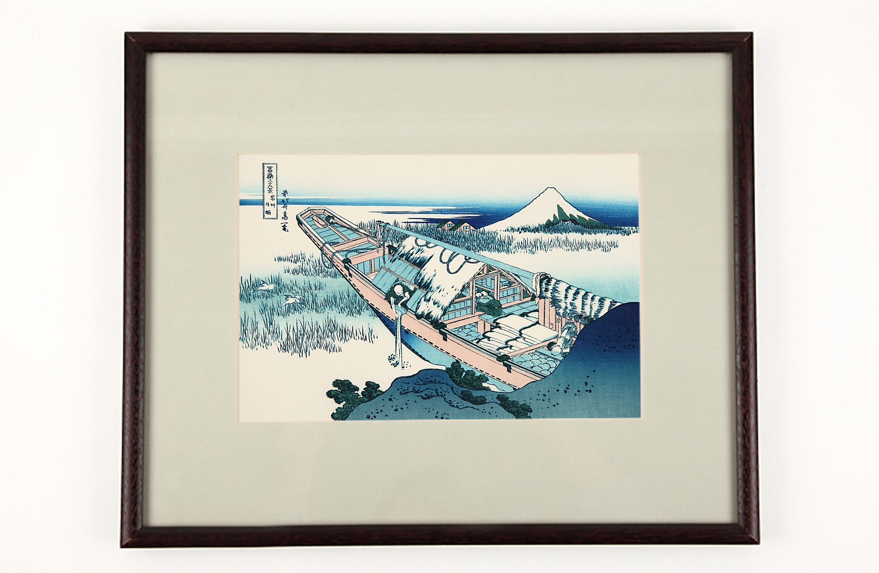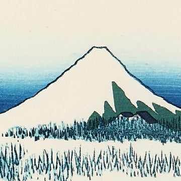 題名のとおり、全図に富士山のある風景を描いたシリーズ物で、葛飾北斎の代表作にとどまらず、浮世絵風景画の代表作ともいわれています。はじめ、三十六図が刊行されましたが、好評のため十図が追加され、計四十六図が刊行されました。当初の三十六図を「表富士」、追加の十図を「裏富士」と呼びます。富士山への篤い信仰は今と変わらず人々の間にあり、当時、集団で富士山に参拝する「富士講」が盛んに行われるなど、こうした社会背景のなかで北斎は『富嶽三十六景』を描き、爆発的ヒットとなりました。