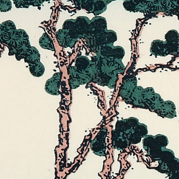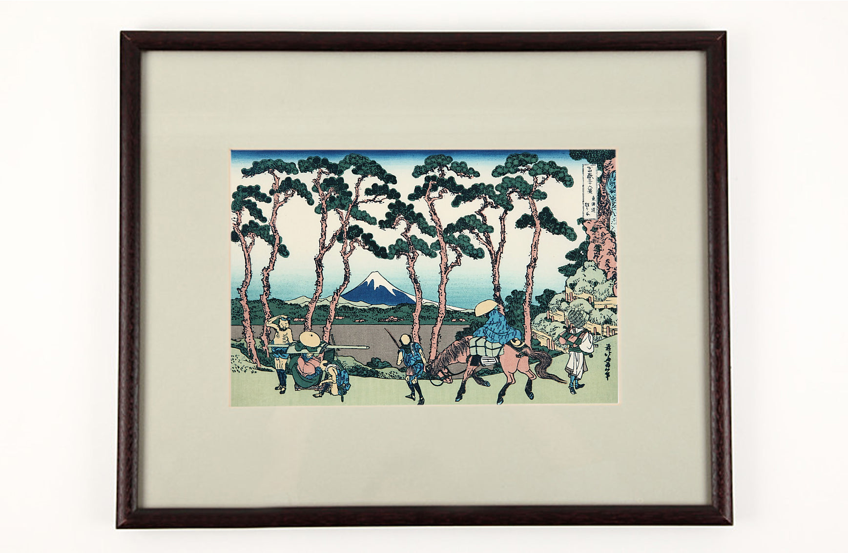 宿場、保土ヶ谷を描き、松並木とそれを通して見える富士山の姿。休む駕籠、そしてどこへ行くのか虚無僧の後ろ姿。これら人物の配置もよく、東海道中の姿をなつかしむ心が湧いてきます。色彩も爽やかで、松並木の松の配置の見事さが、全体の画面を生き生きとさせています。