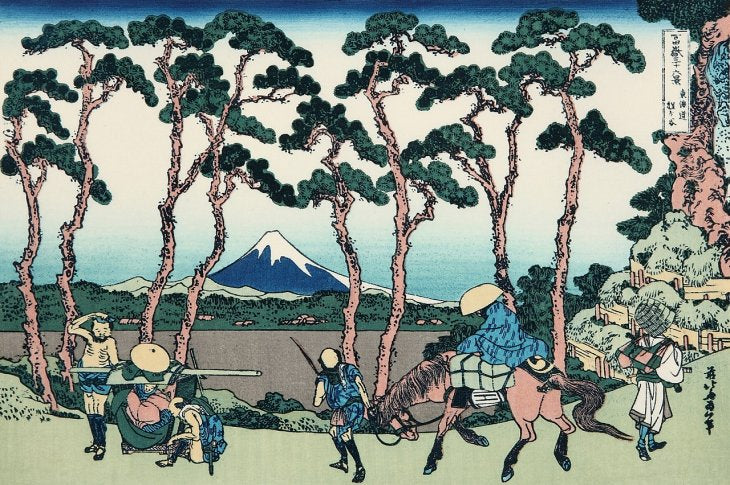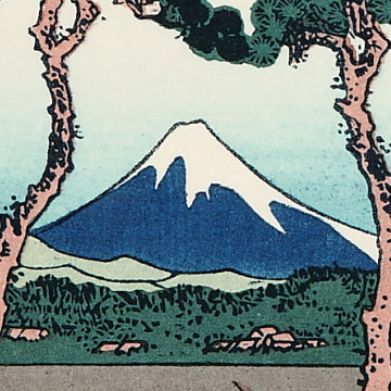 題名のとおり、全図に富士山のある風景を描いたシリーズ物で、葛飾北斎の代表作にとどまらず、浮世絵風景画の代表作ともいわれています。はじめ、三十六図が刊行されましたが、好評のため十図が追加され、計四十六図が刊行されました。当初の三十六図を「表富士」、追加の十図を「裏富士」と呼びます。富士山への篤い信仰は今と変わらず人々の間にあり、当時、集団で富士山に参拝する「富士講」が盛んに行われるなど、こうした社会背景のなかで北斎は『富嶽三十六景』を描き、爆発的ヒットとなりました。