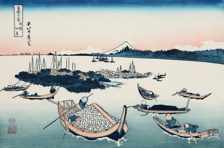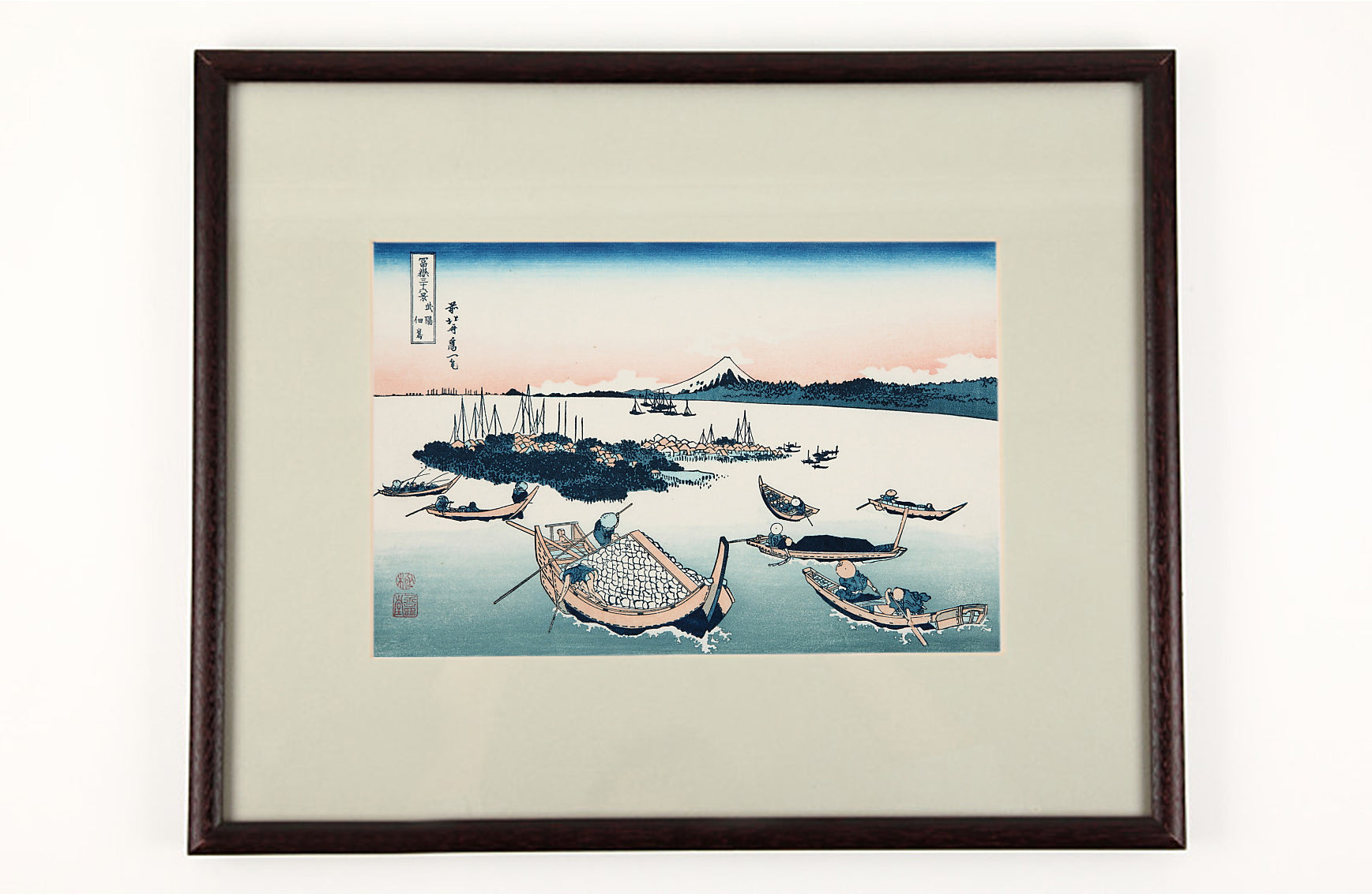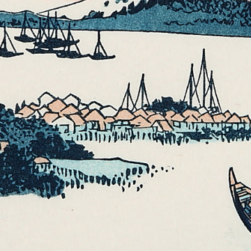 浮世絵風景画に多く描かれていますが、現在は地名だけで島ではなくなっています。絵の中央の島が佃島で漁村も見えます。はるかに富士山を望む東京湾には魚釣りの乗合舟、漁夫のいさり舟などで賑わうなか、遠く富士山の姿が、美しい藍摺りで表現され、この絵をぐっと引き締めて落ち着いたものにしています。