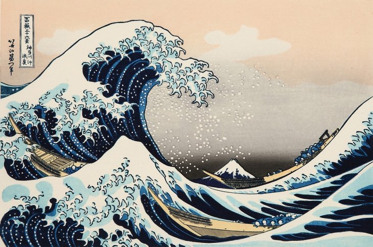 19歳の時、当時の似顔絵役者絵の第一人者だった勝川春章に弟子入り。師の亡くなったあと、北斎は勝川派から離れ、京の琳派の流れをくむ俵屋宗理の名を継ぎ、町絵師として活動を始めました。宗理として3年ほど活動し、北斎と名乗りはじめたのは38歳の頃。40代後半に読本の挿絵の斬新な表現が評判となり、50代になると門人の数も増え、葛飾派として一派を作り上げるまでになります。そして北斎の名を不動のものとした『富嶽三十六景』を手がけたのは、70歳を過ぎてからでした。90歳の頃、「あと10年、いや5年あったら本当の画工になれるのに」という強烈な言葉を残しています。