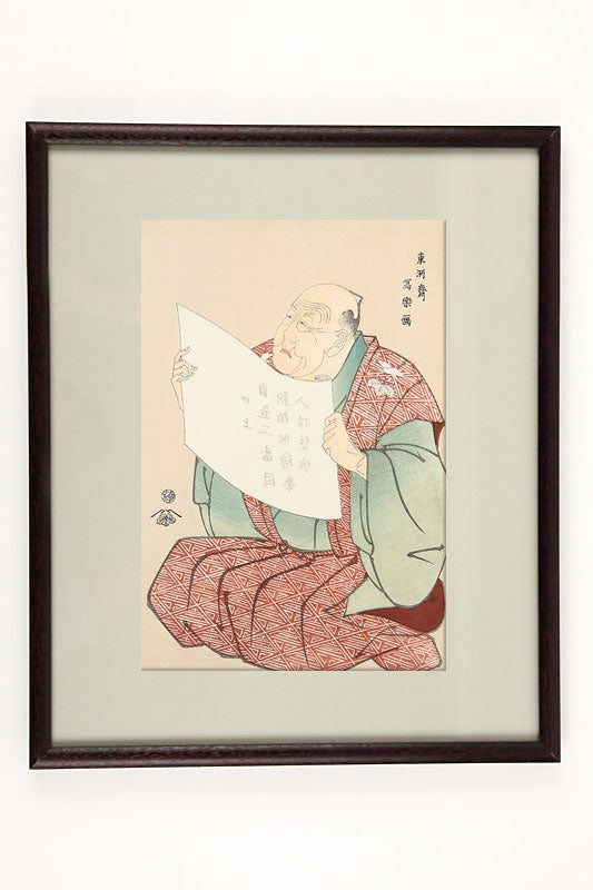 楽屋頭取とは、こうした口上の読み上げのほか、楽屋全体の取締りや舞台の進行をはかる役目で、かつては一流の役者ではないが芝居のこと、故実やしきたりのことに精通し、そのうえ役者たちにも顔のきく古参の役者がこの位置についていました。この表情から、その年輪のほどがうかがえ、写楽の顔面描写の卓抜さには驚くべきものがあります。世界の肖像画家としての技量は、この一図だけでも認められていいのではないでしょうか。しかもわずかな柿色の裃と藍地の単衣だけの色彩で、絵にこれだけの厚みと奥行きを出せるその色彩感覚には溜息すら出てしまいます。