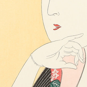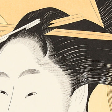この女性は新吉原の廓芸者を描いたといわれ、「と」のついた頭文字の名として富本豊雛が思い出されます。口に手をあて微笑する女性らしい表情は、顔や優美な手の流れるような曲線によって美しく表現されています。漆黒の大きな髪が壮麗さをかもし出しています。このように上半身をアップで描く絵を大首絵といい、大首絵に美人画を取り入れたことで歌麿は、美人画家の名声を不滅のものにしました。