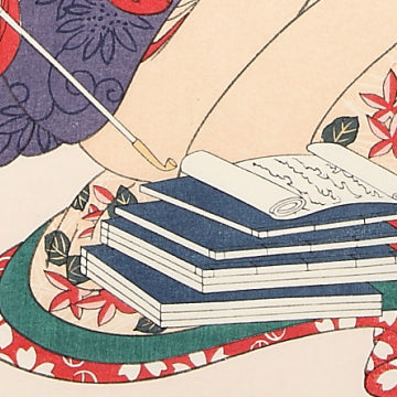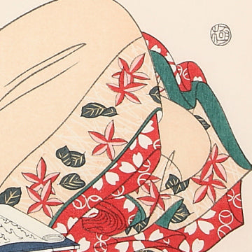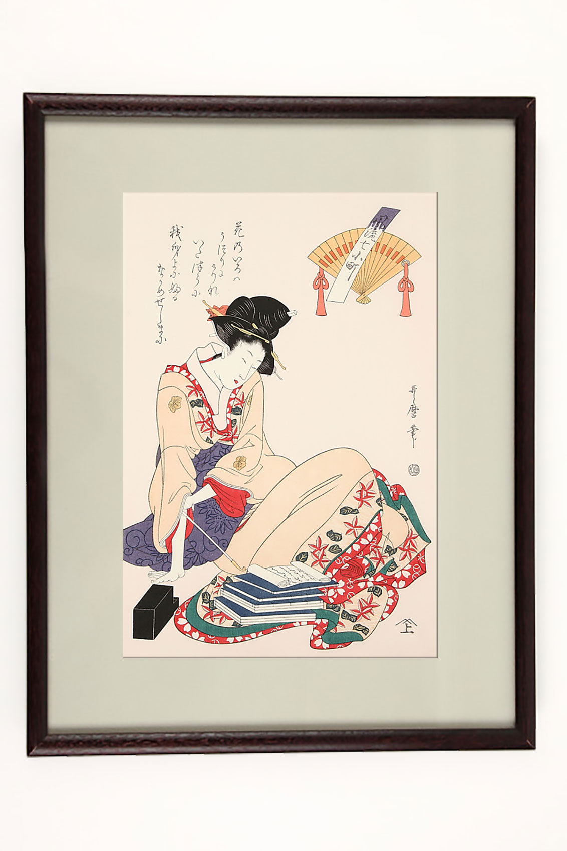 これは心のなかはいまだ春のような美しさを持ちながらも、外見は少しずつ老いて秋色が濃くなってきているのを暗示しているようです。たばこをふかしながら書物を読む気怠い日々のなか、美人にも一日一日と容姿が衰えていく様子がうかがえます。顔が少し痩せ気味で情感が稀薄になったとされる歌麿の最晩年の美人画で、文化2年頃の作品です。