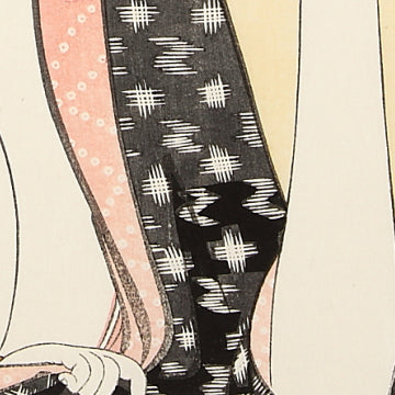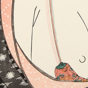 肩から紐で掛けている匂い袋が白くまろやかな乳房の表現に一役かっていて、肩や腕、胸の豊満な温かい女性の肌を的確に表現し、歌麿の手腕を示しています。川岸は吉原内部にあった安女郎のいた所で、歌麿の作品のなかにはこのようなすさんだ女性の描写は少なく、特異な地位ともいえます。
