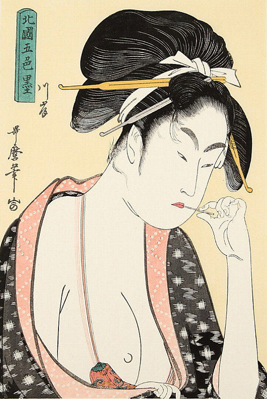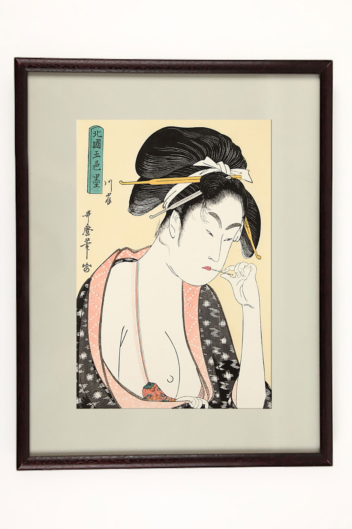 片方の乳房をあらわにし、左手は口にくわえた楊枝を持ち、もう一方は懐に入れた指先が下着からのぞき、ややきつそうな表情が女郎の雰囲気をよくとらえています。