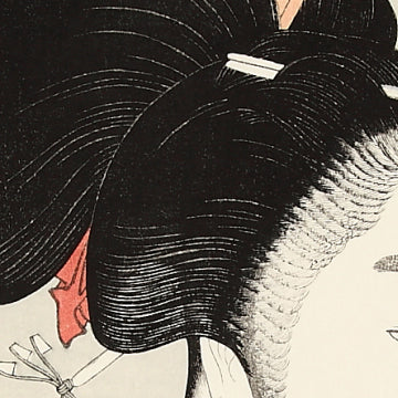 簪を人差し指と親指でつまんで差し直している、ほんのちょっとした仕草をつかんだ描写が心憎くくもあります。あや毛といわれるごく細い毛髪を丹念に掘り出していく、生え際の難しい彫法がみられます。美人表出のひとつの手法として開発されたものだけあって見事な冴えがみられます。